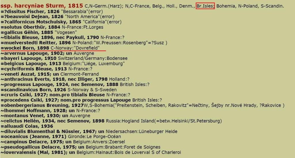 entrambi gli autori citano progressus Lapouge, 1924 e procedens Csiki, 1927 per le Isole Britanniche...unica differenza: queste 2 forme sono sinonimi, per Deuve di wockei Born, 1898, mentre per Brezina di harcyniae Sturm, 1815.