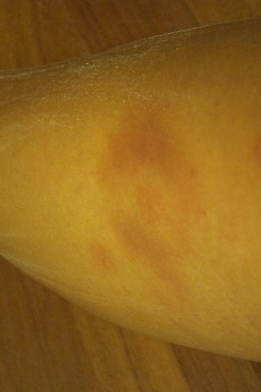 L'eritema non solo non e' mai "migrato", ma sta scomparendo lentamente: (gli eritemi in realta' sono due, diametralmente opposti, uno sulla gamba destra e l'altro sulla sinistra, ed ora si nota che al centro di entrambi gli anelli, ci sono due punture a circa 1cm di distanza).