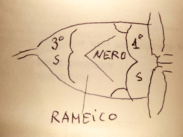 Ho postato due foto...quasi incomprensibili, e aggiungo uno schizzo schematico della mia interpretazione delle zone nere (macchie) e di quelle a riflessi metallici rameici, come le ho viste al binoculare focheggiando e variando l'inclinazione della luce.