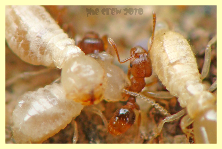 Infatti prima che tu alzassi la tavola tra le due colonie non vi erano scontri: le termiti sono abilissime nel vivere accanto ad altri insetti sociali ostili (siano essi formiche o altre termiti) senza mai incrociarli, ma nel caso la zona venga disturbata e le specie vengano a contatto solitamente lo scontro non tarda. Ho osservato spesso questo fatto durante un viaggio in Thailandia dove le termiti erano il mio target principale, e quindi spaccavo/muovevo legna e altre fonti di cellulosa e scavavo molto. Una volta ho trovato ben 5 specie di termiti che foraggiavano nello stesso pezzo di legno (Macrotermes, Hypotermes, Microcerotermes, Odontotermes e le termiti kamikaze Globitermes sulphureus), ti puoi immaginare che guerra mondiale sia scattata quando sono venute a contatto (soprattutto gli operai di Macrotermes risultarono molto aggressivi). Lo scontro però non è durato tanto, poichè dopo poco tempo le varie specie hanno risigillato le rispettive gallerie. Ho anche osservato diverse specie vivere all'interno delle mura dei termitai di altre; generalmente parlando nelle termiti questo comportamento (inquilinismo) può essere sia obbligato che non, e vi è addirittura un genere di termite neotropico chiamato proprio Inquilinitermes che può essere rinvenuto solo all'interno dei termitai di altre specie del genere Constrictotermes (genere i qui soldati sono dotati di una potente difesa chimica), senza però venirne mai a contatto. Stavo rispondendo al commento precedente che affermava che gli operai di termiti non presentassero mai comportamenti agonistici.