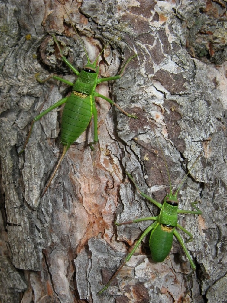 Quando li disturbavo con lo sfregamento delle piccole ali cantavano entrambi. Lo stesso suono la sera mi è capitato poi di sentirlo camminando per i sentieri (un paio di volte sono riuscito a seguire il suono ed effettivamente ho trovato lì altri due maschi), era quindi una specie piuttosto comune da quelle parti.