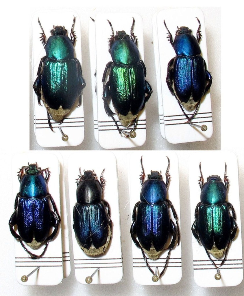 Tra l'altro si vede la livrea più comunde delle femmine (in altro al centro) con pronoto nero e elitre verde-blu.