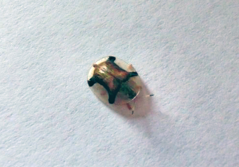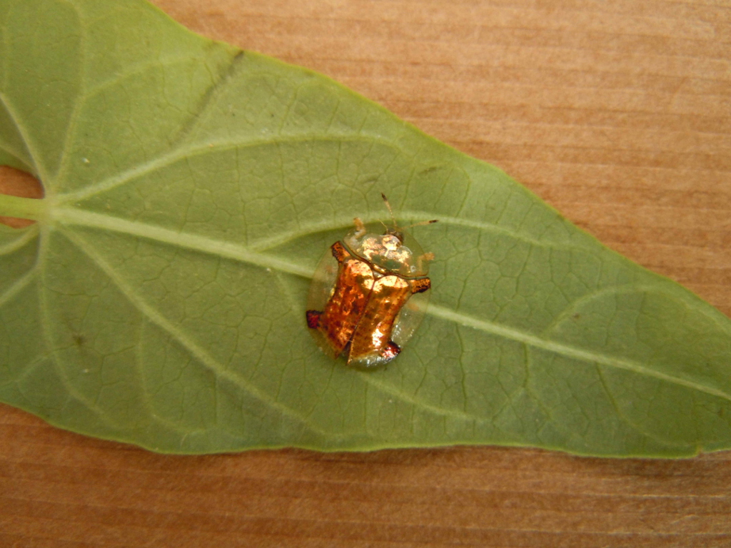 Lo scorso luglio ho raccolto in una aiuola nel campus dell'Università di Haremaya in Etiopia alcune larve di Cassida, lunghe poco più di 1 mm. Tornato in Italia, ho allevato tre esemplari nutrendoli con foglie di convolvulacee spontanee. Il 2 agosto, raggiunte le dimensioni di poco meno di 10 mm, le larve si sono impupate (immagine 1) e sono sfarfallate il 7. Gli adulti hanno le elitre giallastre trasparenti con una specie di croce di Sant'Andrea, inizialmente bronzea (immagini 2 e 3), che dopo qualche giorno è diventata dorata (immagini 9 e 10).