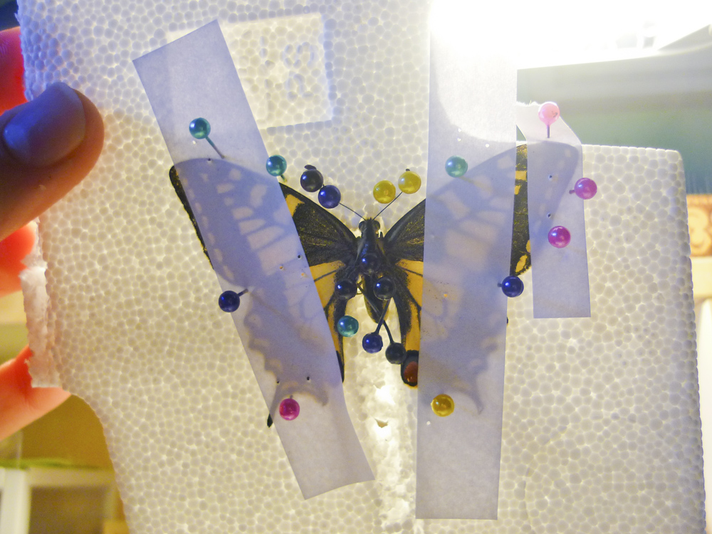 Spiego la storia: l'esemplare è morto 3 giorni fa, e, dato l'ottimo stato di conservazione che aveva mantenuto (le ali sono perfettamente integre e colorate come alla nascita) ho deciso di conservarlo, considerando il fatto che è la prima volta che conservo un insetto. Quindi, grazie a delle guide trovate su internet (principalmente mi sono basato su quella presente nel sito l'arcadinoè.it), 2 giorni fa l'ho messo in una camera umida. Stamattina l'ho tolto perché mi sembrava pronto, e perciò, una volta creatomi lo stenditoio con del polistirolo (ho praticato con un coltello una scanalatura centrale per il corpi), l'ho spillato (anche se con dei comuni spilli da sarta, non quelli entomologici... xD ...non avevo il tempo di comprarli! Comunque per essere il mio primo esemplare sono soddisfatto!)). Adesso che è spillato, non sapevo dove conservarlo per farlo essiccare! Inizialmente l'avevo messo dentro una scatola di polistirolo 20x20x10), ma adesso che mi hai detto come si fa, seguirò il tuo consiglio, e lo metterò sopra il termosifone ad asciugare! Ecco tutto!