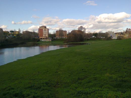 Questo non è lo stesso posto, ma il campo che sta tra Viale Jonio, Via Isola Bella, Via Montasio e Via Romagnoli. In cima al prato sulla destra c'è la scuola dove insegno. In quell'avvallamento, creato quasi 50 anni fa quando hanno intubato una marana locale, si forma un laghetto quasi tutti gli anni, a volte per pochi giorni, a volte per mesi. 5 anni fa si è formato verso dicembre e a maggio non si era ancora asciugato del tutto. Ma non c'entra niente con le esondazioni dell'Aniene. Si forma con l'acqua piovana drenata dalla zona circostante, soprattutto il prato ad est, ma anche quello a nord (l'acqua scorre sotto viale Jonio e se ne vede il percorso segnato dalla vegetazione che va verso il laghetto temporaneo. L'esondazione dell'Aniene si ha tra l'Aniene e via Nomentana.