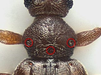 Ho indicato qui la posizione delle tre fossette del protorace. Quella centrale è molto poco evidente, poco profonda, e si vede solo con luce radente o inclinando l'insetto in avanti. Nella foto, con luce mediamente diffusa, non si nota minimamente, nemmeno nell'originale a 18 Mp (si vedono le altre due). Dalle fossette laterali a quella centrale non ci sono solchi.