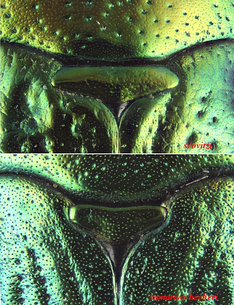 In questa foto ci sono gli scutelli delle due specie (alla stessa scala di ingrandimento), in alto Sphenoptera (Chrysoblemma) scovitzii scovitzii, in basso Sphenoptera (Chrysoblemma) tamarisci beckeri.