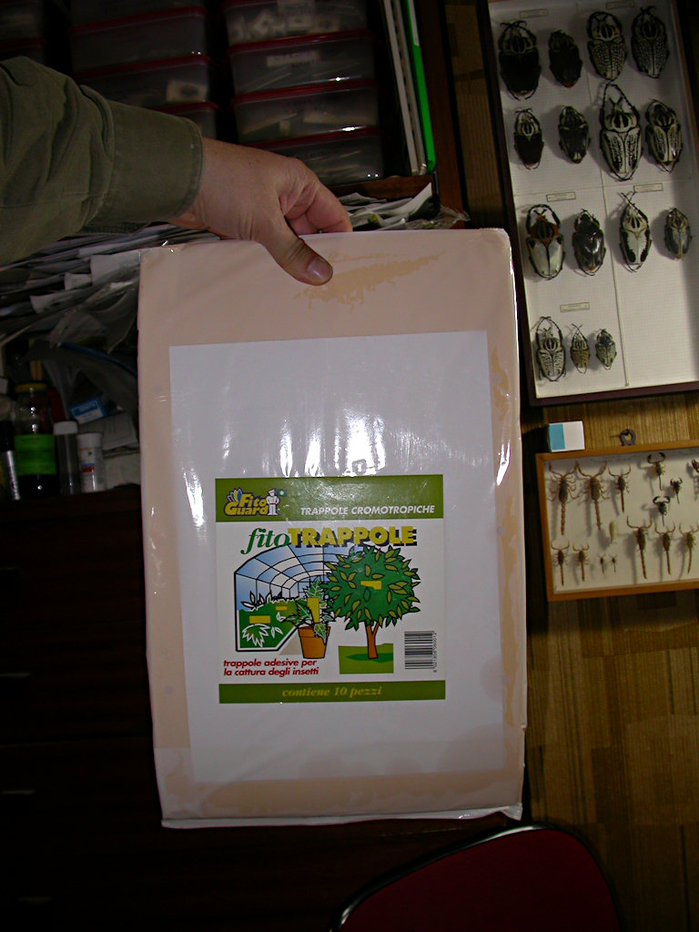 In realtà esistono anche dei fogli di carta gialli e molto adesivi che si utilizzano nella lotta alla mosca dell'olivo, e che andrebbero benissimo anche per molti altri insetti. Gli esemplari si scollano poi facilmente con un pò di benzina Avio o trielina. Il problema è che non sono di facile reperimento. Di contro, essendo cartoncini, si potrebbe provare a catturare, ad esempio, le specie che frequentano le cime degli alberi (si parla di specie acrodendriche, ma io credo sarebbe più corretto utlizzare il termine acrodendrobie e/o acrodendrofile).