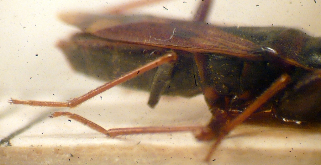 In questo Eremocoris c'è qualcosa che apparentemente non funziona. Negli Eterotteri le zampe posteriori sono sempre più lunghe rispetto a quelle intermedie, In questo esemplare, in aggiunta all'arto soprannumerario, le zampe più lunghe occupano la posizione centrale. Potresti scollare l'esemplare e mostrarci una fotografia in visione ventrale?