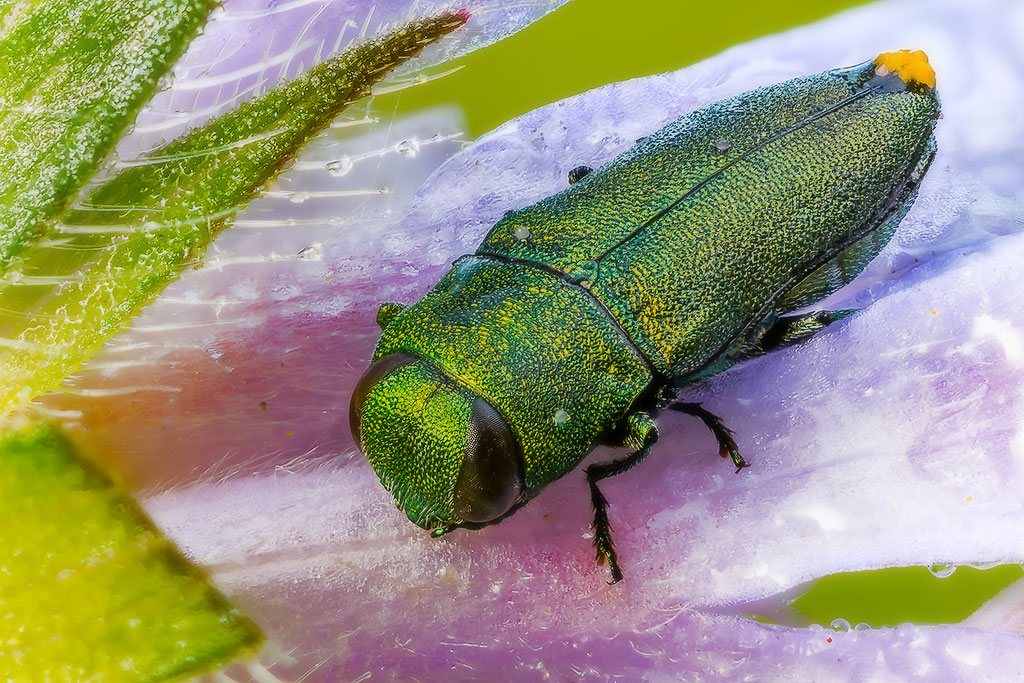 E' una delle poche specie di Buprestidi nostrani che passa spesso la notte sui fiori. Infatti dalle gocce di rugiada deduco che l'hai fotografata la mattina presto.