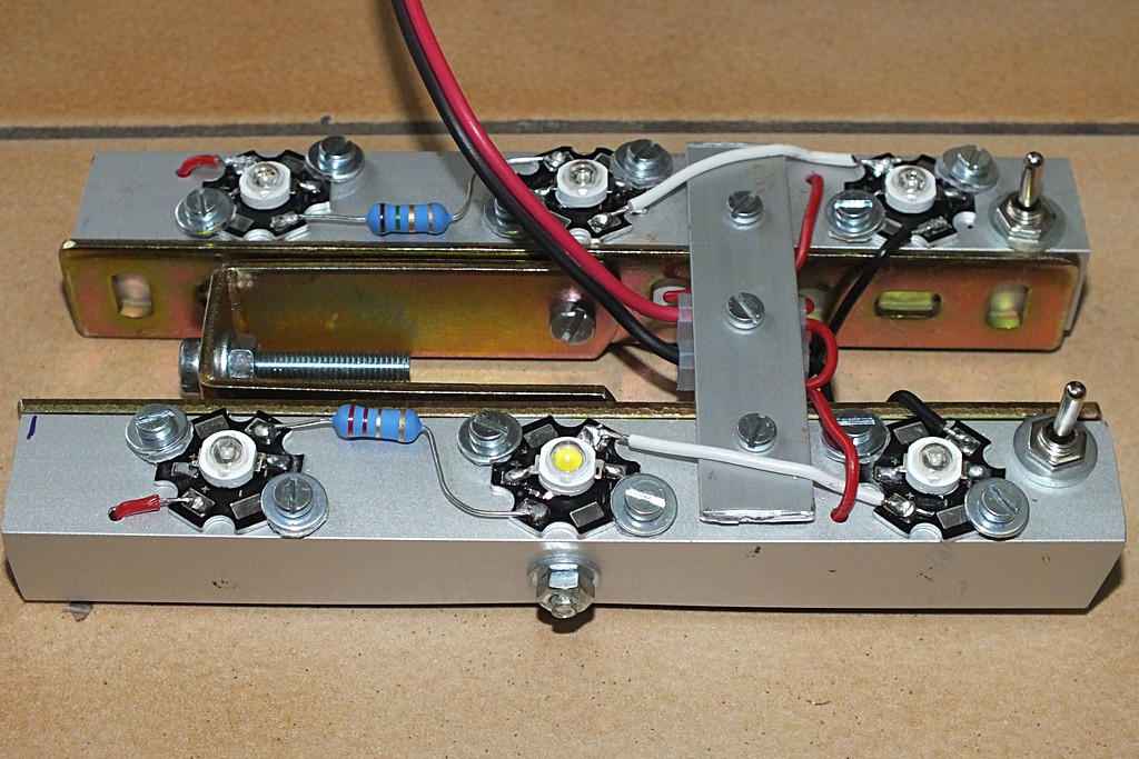 Passiamo ora al sistema di illuminazione vero e proprio. Si basa su 6 led da 3W ciascuno. Questi sono tra i più piccoli tra i LED ad alta potenza in vendita attualmente (ve ne sono di potenza crescente che arrivano fino a 500 W, e forse anche oltre). Insieme a quelli da 10 Watt, in base alle prove che ho fatto, si sono rivelati i più adatti per i nostri scopi. Considerate che maggiore è la potenza dei LED, maggiore sarà la richiesta di energia, e di conseguenza, per un sistema a batterie, maggiore il peso, l'ingombro e il costo di queste ultime. Bisogna anche tenere conto del fatto che i LED ad alta potenza, a differenza degli altri, che restano praticamente freddi, producono parecchio calore. Calore che va smaltito, altrimenti i LED si scaldano sempre più fino a fondere. Questo problema è minimo fino a potenze di 1 Watt, ma già si fa sentire con quelli da 3 Watt, e diventa critico già con quelli da 10 Watt. Per cui, da 3 Watt in su è necessario prevedere un dissipatore di calore. Per quelli da 3 Watt è sufficiente attaccarli ad una superficie metallica sufficientemente estesa (potenze superiori richiedono dissipatori appositi, ingombranti e che a volte hanno anche ventole che assorbono altra corrente). In questo caso ho usato dei profilati di alluminio con profilo ad E. Il sistema è costituito da due circuiti indipendenti, ciascuno comandato da un interruttore, che mi permette di accendere 3 led, gli altri 3, o tutti e 6 insieme. Ogni circuito comprende 3 led ed una resistenza. Il valore delle resistenze è calcolato in funzione della tensione di funzionamento dei vari led, che non è uguale per tutti (vanno di solito da 3,2 a 4 Volt), ma cambia a seconda del modello. Su un circuito ho montato 3 LED UV da 370-380 nm, con una resistenza da 1,5 ohm, 2 Watt (i tre in secondo piano). Sull'altro ci sono 2 LED UV da 390-405 nm (al limite tra ultravioletto e violetto), ed un LED bianco da 6500-7000°K, con resistenza da 2,2 ohm 2 Watt. I LED in ogni circuito sono montati in serie. Il LED bianco si riconosce perchè da spento è giallo, mentre gli UV sono incolori. La funzione del led bianco è duplice: permette di vedere meglio cosa arriva alla luce, e fa chiudere le pupille, in modo che gli UV diano meno fastidio alla vista. Non dovrebbe avere quasi effetto sulla capacità di attrarre insetti dell'intero sistema. In futuro penso che sostituirò i due led centrali con due turchesi da 490 nm (quando mi arriveranno!), poichè dovrebbero contribuire anche ad aumentare l'efficacia nell'attirare insetti. Questa piastra è dotata di un pezzo centrale in grado di ruotare, comprendente un perno (un semplice bullone da 5 mm di diametro), che serve a fissare la piastra sul manico dell'ombrello. Ecco la piatra in posizione di montaggio, vista dal lato superiore (prima era in posizione da trasporto, rigirata).