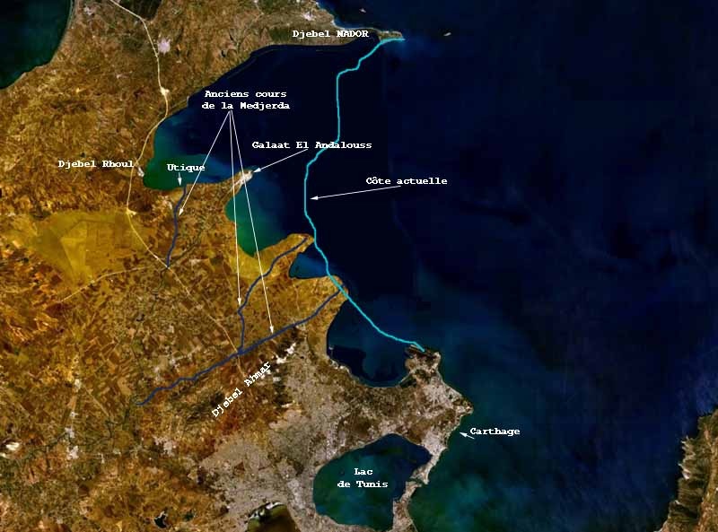 1500 anni fa lo spostamento a sud del corso del fiume Medjerda ha riempito di detriti la laguna del la parte nord del golfo di Tunisi (Cartagine) in cui in epoca romana Utica e Cartagine erano citta' sulla punta di penisole. La Medjerda si e' poi riposizionata piu' a nord.