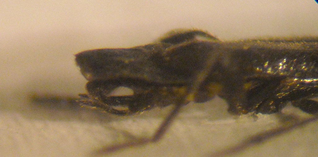 Gli ultimi due segmenti addominali (i dorsali sembrano normali, solo un poco curvati verso il basso) sono a forma di forca. Il penultimo, coperto dall'ultimo, è formato da due bracci che poi sembrano unirsi all'apice e curvarsi verso l'alto dietro l'apice l'ultimo segmento dorsale.
