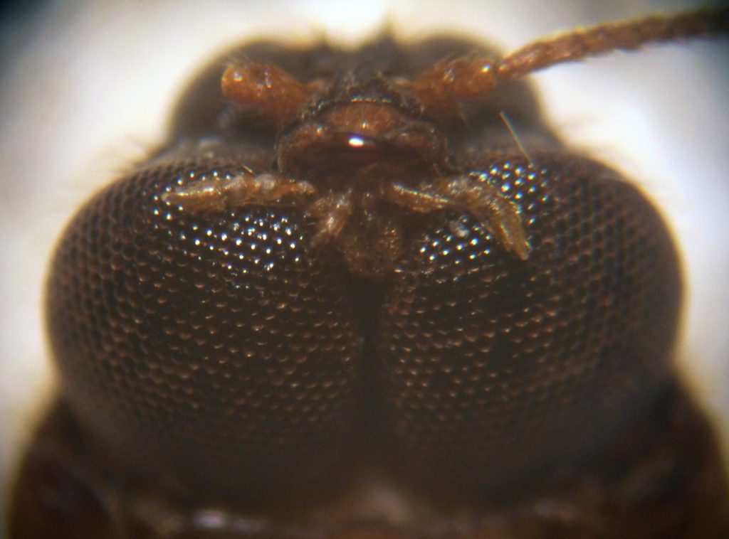 A prima vista mi sembrava un Lampiride normalissimo, ma dopo averlo ammorbidito l'ho osservato un po' sotto il microscopio ed ho notato una cosa stranissima: guardando da davanti la testa si nota un paio di occhi dorsali soprelevato, l'inserzione delle antenne e un piccolo paio di mandibole e sulla faccia ventrale ci sono altri due occhi grandi il doppio di quelli dorsali. Potrebbe essere un adattamento simile a quello che i Gyrinidi usano per guardare contemporaneamente sopra e sotto la superficie degli specchi d'acqua dove vivono?