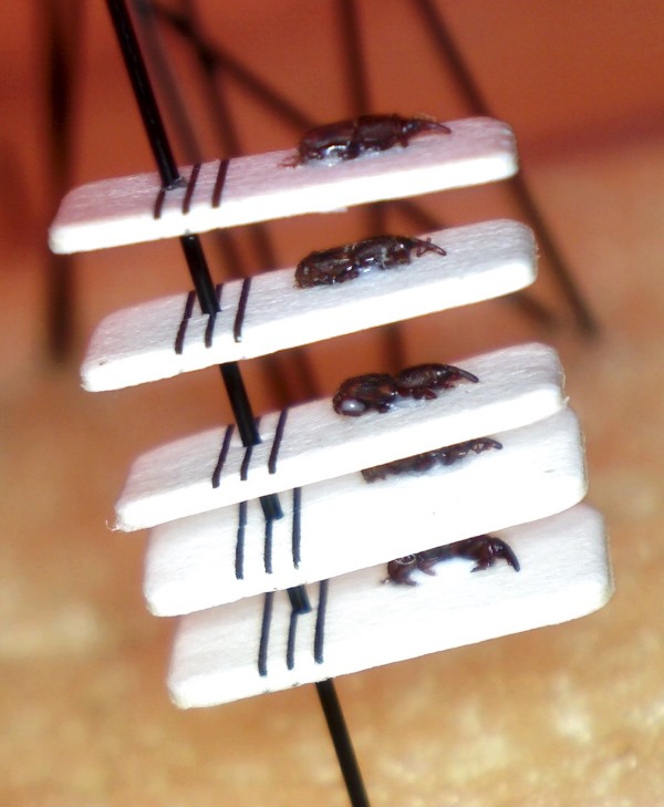 Per quelli della seconda foto, tranquillo, non scollare niente, sono tutti e quattro Paromalus (Paromalus) parallelepipedus (Herbst, 1791) Histeridae, Dendrophilinae, Paromalini Quella illustrata da Giovanni è la classica "brochette", molto in uso negli anni passati (anche io, per la collezione generale, negli anni '80 ho utilizzato questo sistema) Tuttavia, confermando quanto detto da Alessio, ora preparo solo un esemplare per spillo, anche se ne ho 200. Considera che molto spesso, sotto al cartellino con l'esemplare, c'è quello con i genitali, poi logicamente quello con i dati di raccolta (a volte anche 2) poi quello della determinazione e magari quello della collezione di appartenenza.... Considera anche che, nello specifico caso degli Histeridae, questi vanno osservati anche ventralmente e in questo caso, io utilizzo cartellini forati..... Al limite, se sei sicuro che si tratti della stessa specie e i dati di raccolta sono identici, puoi preparare sullo stesso cartellino un esemplare incollato ventralmente e uno dorsalmente (come nella prima foto), oppure il maschio e la femmina. Ovviamente, tutto questo, sempre in caso di esemplari piccoli; con quelli più grossi il discorso non sussiste!