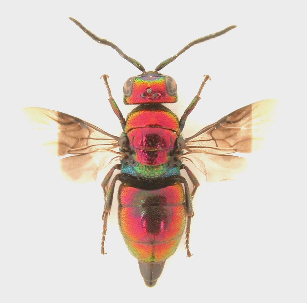 Questo esemplare mi mette in difficoltà. Nelle unghie dei tarsi noto un solo dente preapicale robusto e diretto verso l'apice: e per questo direi Hedychrum. Però il margine del T-III ai lati non è angolosamente sporgente. Come aspetto generale in prima battuta avrei detto Holopyga, in particolare una femmina di Holopyga fervida: ma rispetto agli esemplari che ho in collezione questo è diverso. Ad esempio lo scapo è più slanciato, il metanoto ha un diverso colore e il margine del TIII appare molto meno appuntito.