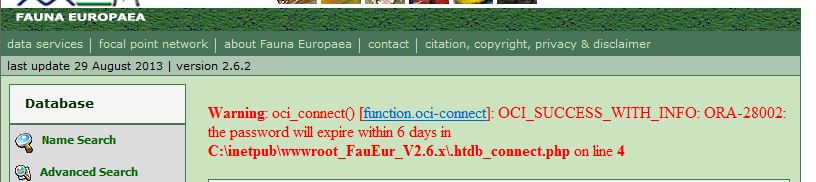 Nello specifico il problema dovrebbe essere una sorta di bug della connessione al database Oracle sottostante (dichiarato con status: Not a bug). Non c'è quindi una password utente che scade davvero fra sei giorni; dovrebbe essere solo una segnalazione d'errore non corretta. Mi sa che gli amministratori di FaunaEur dovranno smanettare un poco per farla sparire... Niente, comunque, che debbano/possano fare gli utenti.