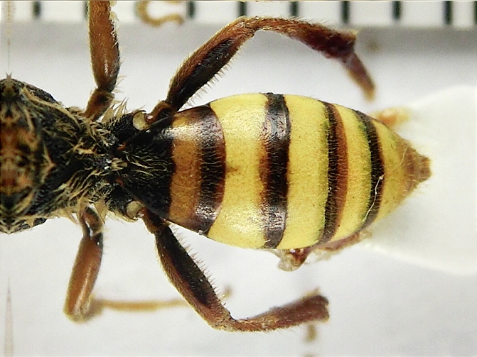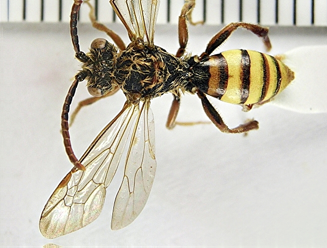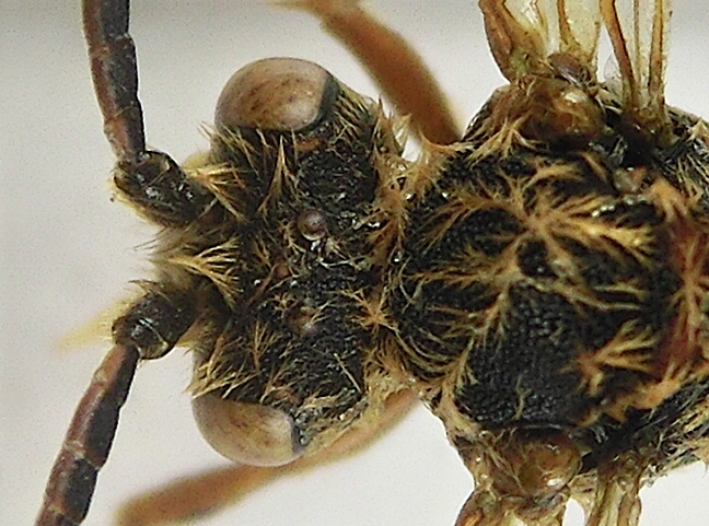 Uno dei caratteri che distinguono gli Apoidei dagli Sfecoidei è la presenza di peli piumosi almeno su capo e torace nei primi e peli singoli (non ramificati), quando presenti, nei secondi. Qui si vede bene che sono peli del primo tipo.