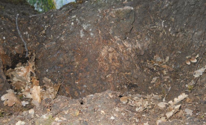 "La buca" nella diramazione è profonda circa 30 cm larga circa 90 cm non è poi cosi piccola..... Alla base della fossa ho provato ad inserirci un filo di ferro che si insinua molto in profondità...ma non mi riesce a capire se è una galleria di una larva perchè è un punto molto nascosto e coperto da residui. Il filo di ferro si insinua all'interno del foro per altri 40-50cm.