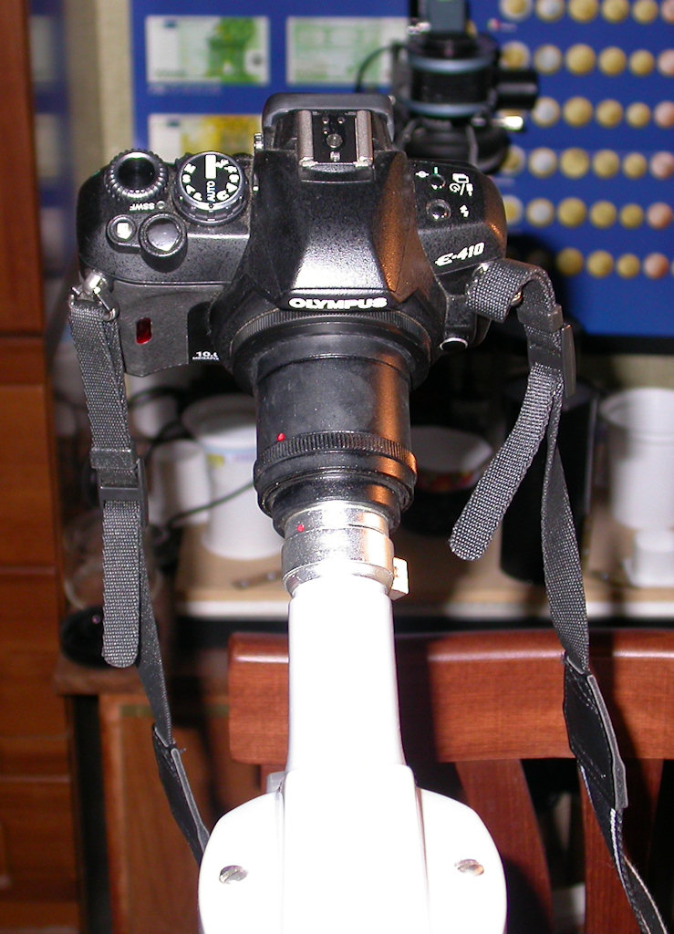 Il raccordo reflex/tubo, non è un semplice anello ma ha una lente che elimina la vignettatura, assicurando la visione come attraverso l'oculare! Ovviamente la reflex lavora senza obiettivo e senza automatismi. La manopola che si vede sul fianco dell'apparecchio, serve ad orientare uno specchio che, in posizione "vis 1 x" consente la normale visione streoscopica agli oculari, posizionata su "fot 1,6 x" devia il fascio ottico dell'oculare di sinistra al tubo.