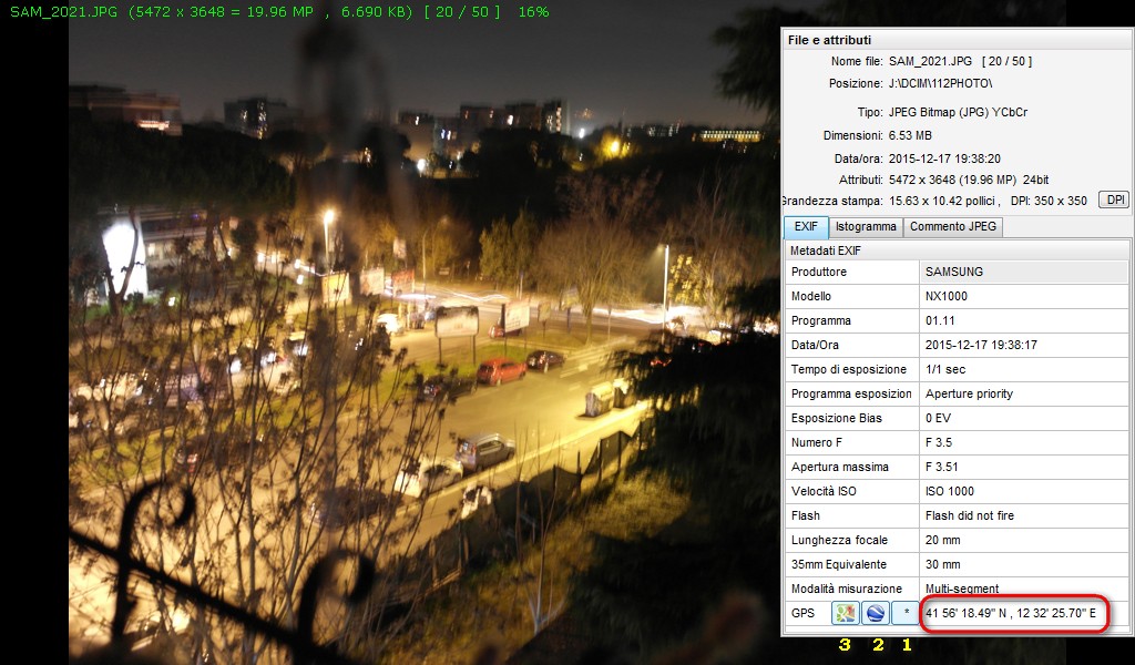 Vi mando una foto di prova, su cui potete vedere come funziona (non fate caso alla qualità della foto, scattata di notte dal mio balcone senza cavalletto). Se provate a vedere come vengono utilizzati i dati gps con altri programmi, fate sapere che succede.
