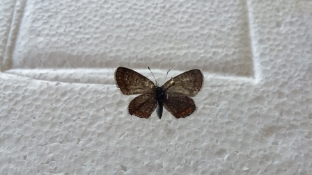 Questo malconcio esemplare di Sardegna è ancora più piccolo, però la foto è più grande e la macchia arcuata si vede meglio. Femmina di Polyommatus icarus (Rottemburg, 1775).