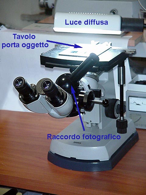 Come vedete, è un microscopio biologico invertito, in questo modo ha la parte superiore del tavolo completamente libera. Possiamo così montare sopra al tavolo una comune lampada di tipo da scrivania, con la luce diffusa da una comune lampada fluorescente. In questo modo possiamo spostare l’illuminazione come vogliamo, in alto, in basso, ovunque vediamo che si creano meno riflessi. E’ una tecnica che in microscopia è usata per accentuare l’effetto tridimensionale delle strutture ed è chiamata Illuminazione Radente Inversa (IRI).