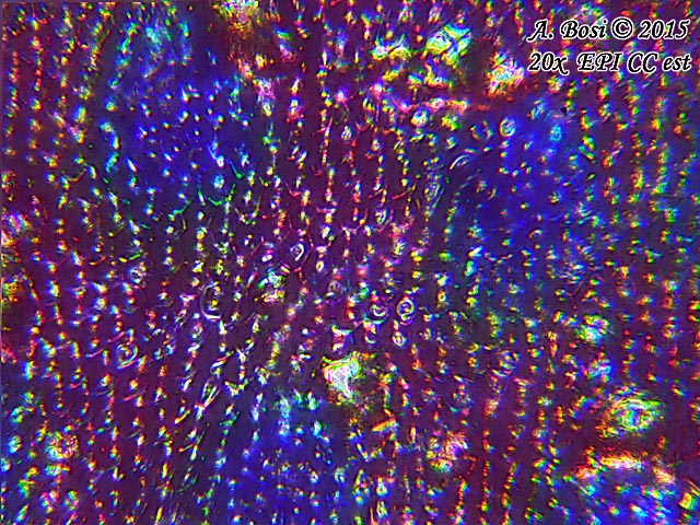 Dobbiamo però arrivare ai 200 ingrandimenti complessivi per vedere bene che ogni cellula del tegumento ha un suo colore, o meglio, ha una sua gamma di colori, ciascuno espresso con varie sfumature.