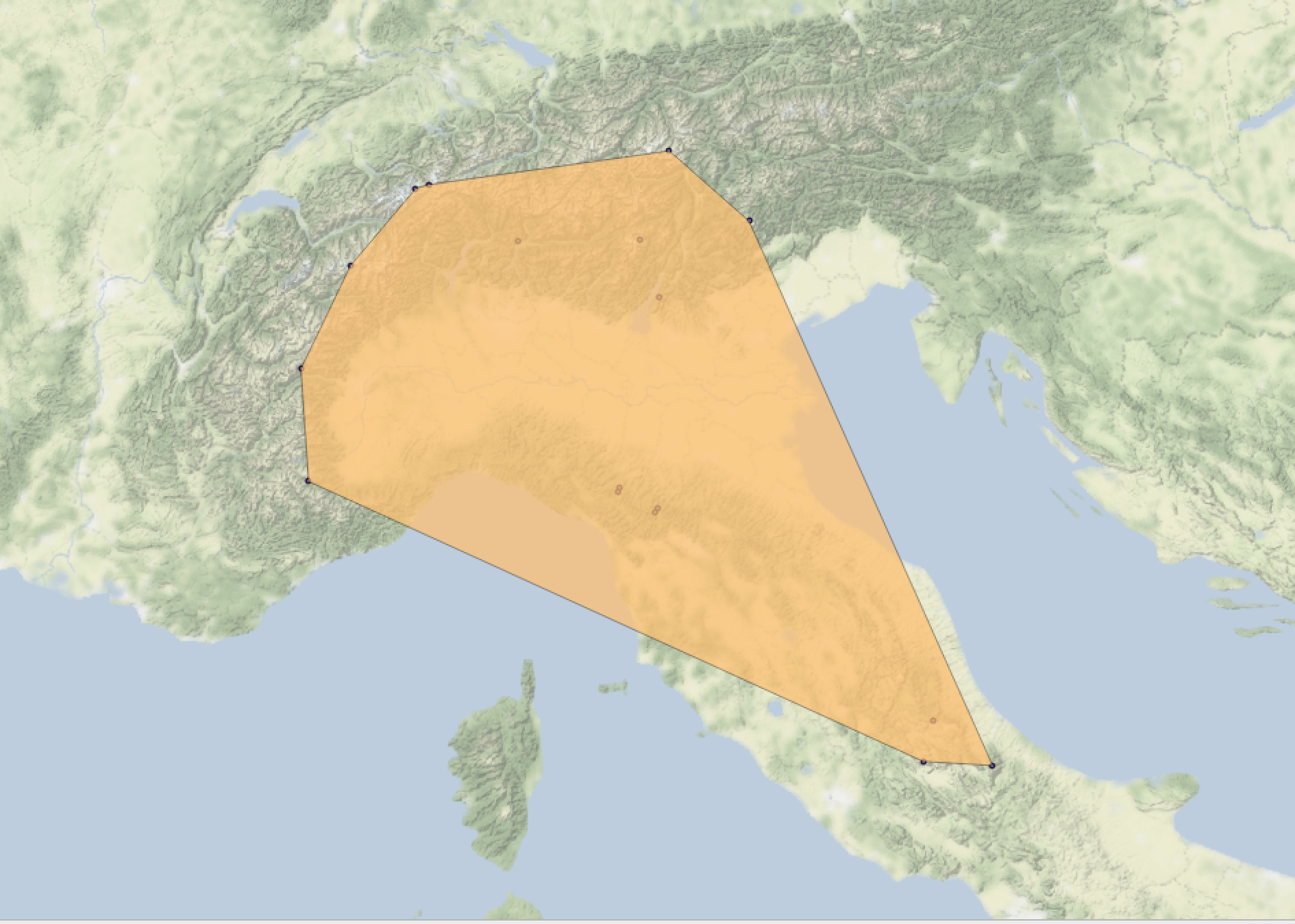 Ti faccio un esempio: su un gruppo di punti come questo che hai in figura il minimo poligono convesso disegnerebbe un areale come quello nella figura successiva, mentre per noi sarebbe logico ovviamente disegnare un altro areale, più basato sulla morfologia del territorio e sulla biologia della bestia. Per esempio, è decisamente poco plausibile che una bestia che, come è evidente dai punti, sta sulle montagne, arrivi nel mar Tirreno. Poi la trattazione sugli areali sarebbe lunga. Tempo fa mi ero anche messo a farli con R con un programma che è più sofisticato del minimo poligono convesso, ma comunque insufficiente ad avere degli areali "intelligenti".