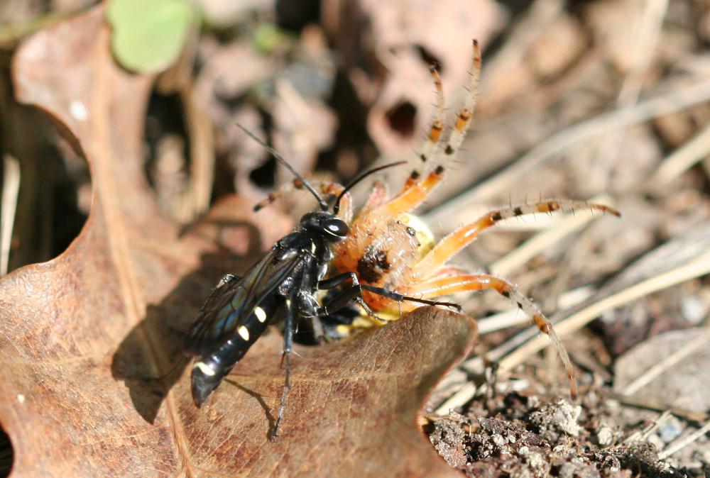 Un Icneumonide aveva fatto una preda. Il ragno era ancora vivo ma immobilizzato; solo una zampa aveva ancora una piccola vibrazione. L'imenottero lo stava trascinando, con una forza spettacolare, sopra alcune foglie secche.