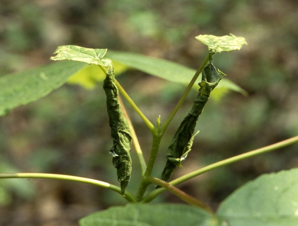 Nelle zone in cui la specie è frequente, si vedono quasi tutte le foglie più giovani ridotte in questo modo