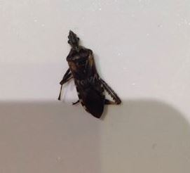 Sì ma cosa sia nessuno gliel'ha detto! Allora lo dico io: è un emittero esotico della famiglia dei Coreidi, il Leptoglossus occidentalis, legato a conifere (Pini per lo più sui quali punge le giovani pigne). Bestia americana. Quindi la supposizione che possa essere atterrato su qualcuno e trasportato in casa è una delle ipotesi plausibili, ma in inverno tendono a entrare nelle case per svernare. Vero è che è innocuo per l'uomo.