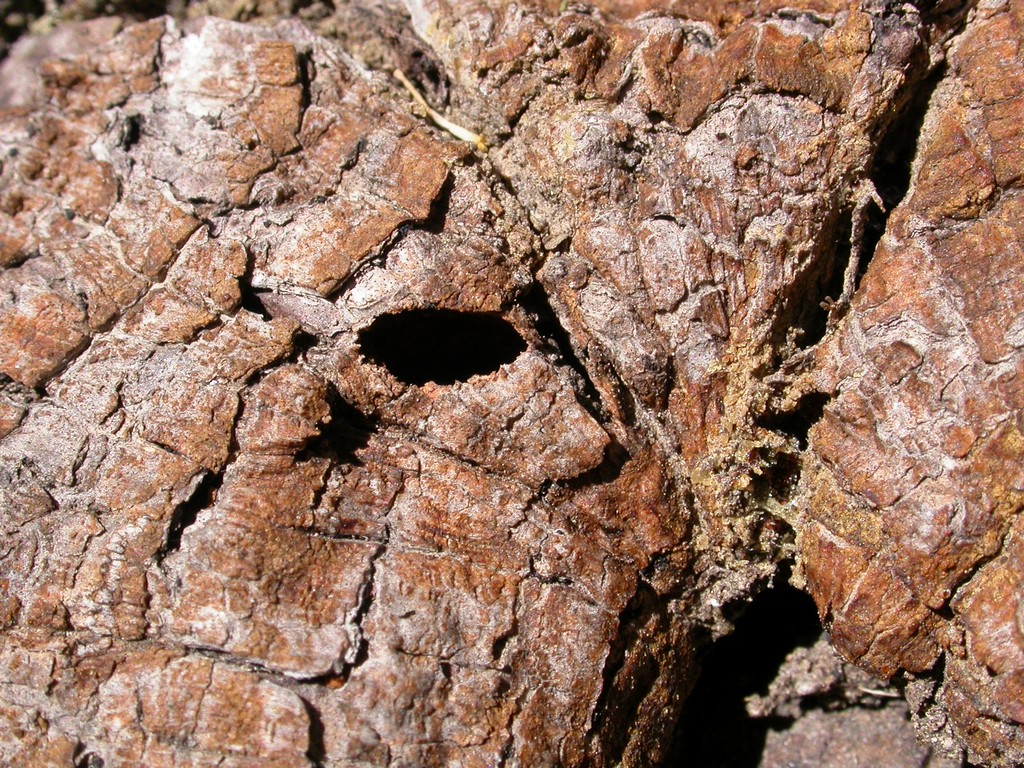Uno dei momenti che non dimenticherò mai delle mie (poche, purtroppo) escursioni sul Pollino, è stato quando, in solitaria, come mio solito, stavo percorrendo un sentiero che porta da Duglia alle Serre. Ero nel tratto alto della abetina, che vi mostro in questa brutta foto. Mi sono fermato a controllare la base di un abete bianco, e sono rimasto in ginocchio ed in silenzio per qualche minuto, ed ecco che a 4-5 metri di fronte a me è comparsa una martora che gironzolava tranquilla e ogni tanto mi guardava senza però, evidentemente, considerarmi pericoloso. Dopo qualche minuto, ho provato a fotografarla. Non l'avessi mai fatto! Appena ho alzato la macchina, è partita come un razzo, è con tre salti è scomparsa! Non sono riuscito a farle neanche una foto. Mi sono consolato un po' fotografando questo foro d'uscita probabilmente di Chrysobothris chrysostigma, specie abbastanza frequente sulle Alpi, ma che più a Sud si trova solo sul Pollino, dove non credo sia comune.