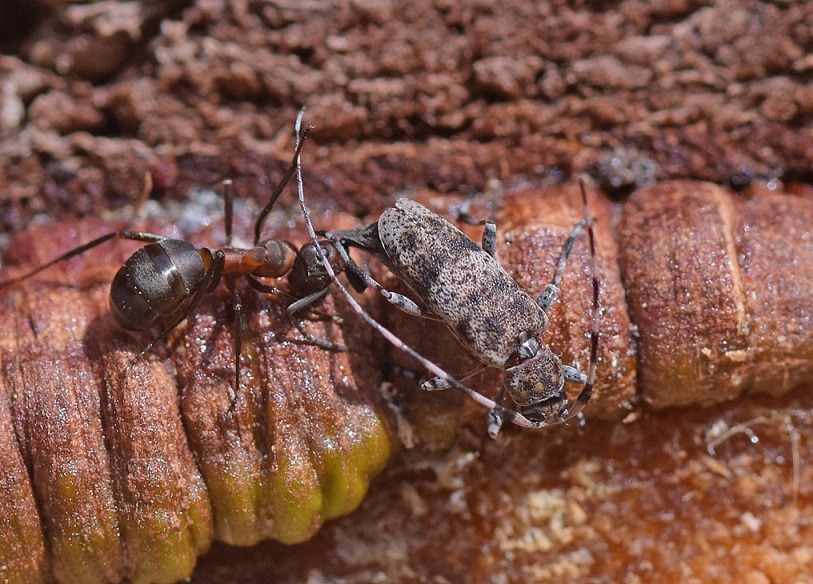 la catasta di tronchi che da un po di tempo mi stava regalando tante soddisfazioni si sta trasformando in un formicaio, :x ormai sono centinaia le formiche Rufa che cacciano tutto ciò che trovano, Buprestidi a parte, larve e qualche Cerambicide di piccole dimensioni, come questo Acanthocinus griseus, il coleottero veniva trascinato per l'ovopositore senza che questo riuscisse a liberarsi,