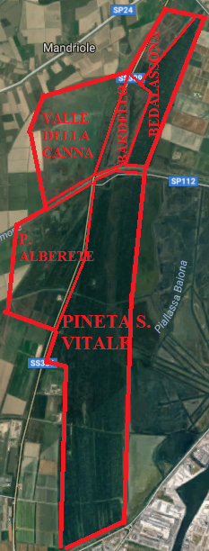 Questa la mappa dell'area. Quindi la Pialassa della Baiona vera e propria va esclusa, ma si deve tenere conto della sua sponda occidentale presso la pineta di S. Vitale. Infatti in Contarini et Caragnani (1980) si parla, a proposito di Dyschiriodes tensicollis, di "argille barenali".