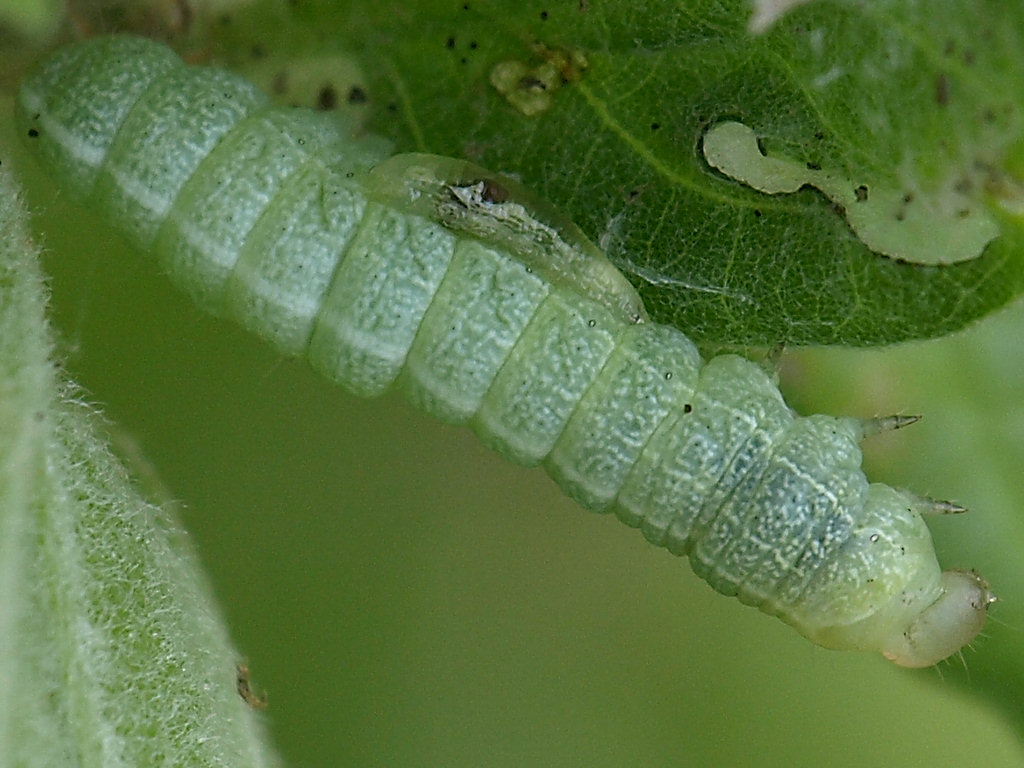 Tra le giovani foglie di quercia se ne notavano alcune appiccicate tra loro a formare un riparo. Ne ho aperto uno e ci ho trovato un bruco, a cui hi scattato qualche foto (pessima, perchè c'era troppo vento). Guardandole a casa mi sono accorto che il bruco non era solo, ma aveva accanto una larva di non so quale imenottero parassitoide.