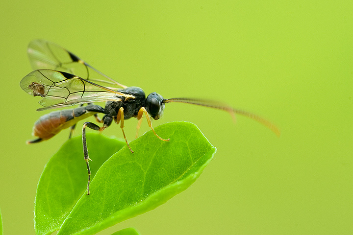 Se proprio si volesse azzardare la sottofamiglia proverei con Tryphoninae (forse proprio genere Tryphon) ma per confermare la determinazione serve l'esemplare sotto lo stereoscopio. Quindi rimane per adesso Ichneumonidae gen.sp.