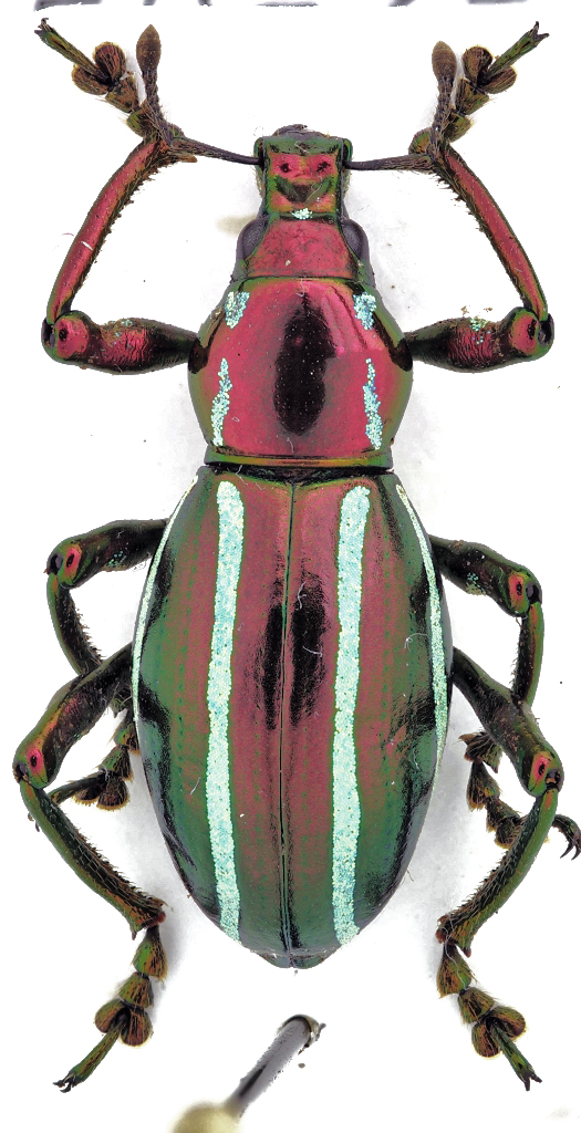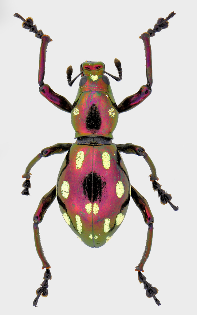 Tornando alla foto del Ceroglossus, non posso non convenire che sia una bellissima foto, ma .... qui vien fuori il "caca-dubbi" leccese, pignolo quasi quanto quello veneziano :mrgreen: :mrgreen: In pratica, i Ceroglossus hanno tegumenti lucidi che il diffusore utilizzato opacizza totalmente, penalizzando la veridicità dell'immagine. Sto affrontando lo stesso problema con i Pachyrhynchus, che assumono un aspetto totalmente differente se resi opachi o lucidi. Allego qui sotto la foto di un Pachyrhynchus (nuova specie in descrizione ;) ) nelle due "versioni" per rendere l'idea.