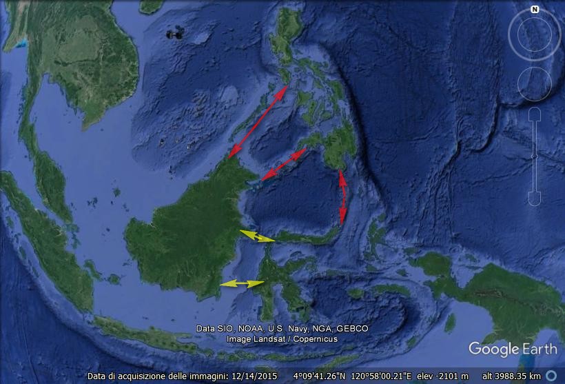 Immagino che i corridoi di passaggio, probabilmente in entrambi i sensi, siano (o siano stati) costituiti dalle innumerevoli isole tra Mindanao e Sulawesi Nord, tra Mindanao Ovest e ed il Borneo e soprattutto tra Mindoro, Palawan ed il Borneo. Con probabili passaggi tra Borneo e Sulawesi nelle aree meno distanti, soprattutto durante le regressioni marine dei periodi glaciali.