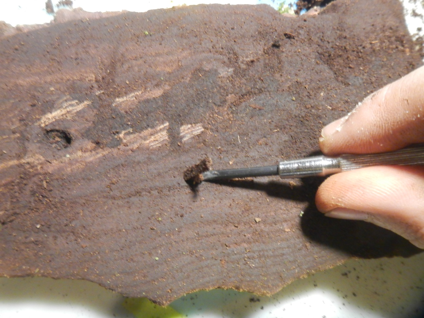Si prende una corteccia lavorata e si praticano delle incisioni dove alloggiare la larva grazie a qualche strumento, ad esempio un piccolo cacciavite.