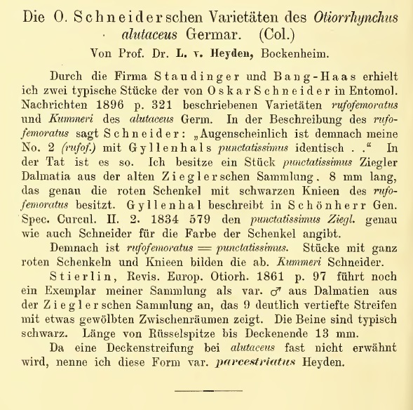 Dovrebbe trattarsi della varietà rufofemoratus di Schneider (1896), poi considerata identica a Otiorhynchus punctatissimus da Heyden (1909) (che inserisco sotto).