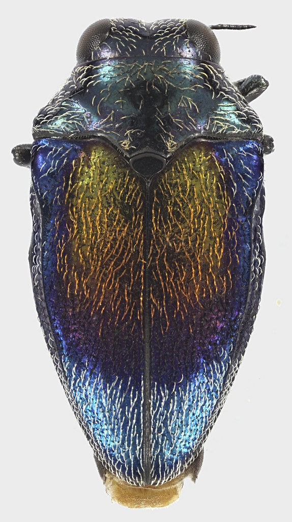 La macchia discale, che in foto appare verde giallastra, con l'insetto illuminato dal sole va dal verde dorato al giallo aranciato, al rosso rame, fino a diventare violacea e fondersi poi col blu di fondo delle elitre, che verso l'apice vira verso il turchese. La luce artificiale non riesce ad evidenziare tutte queste sfumature di colore.