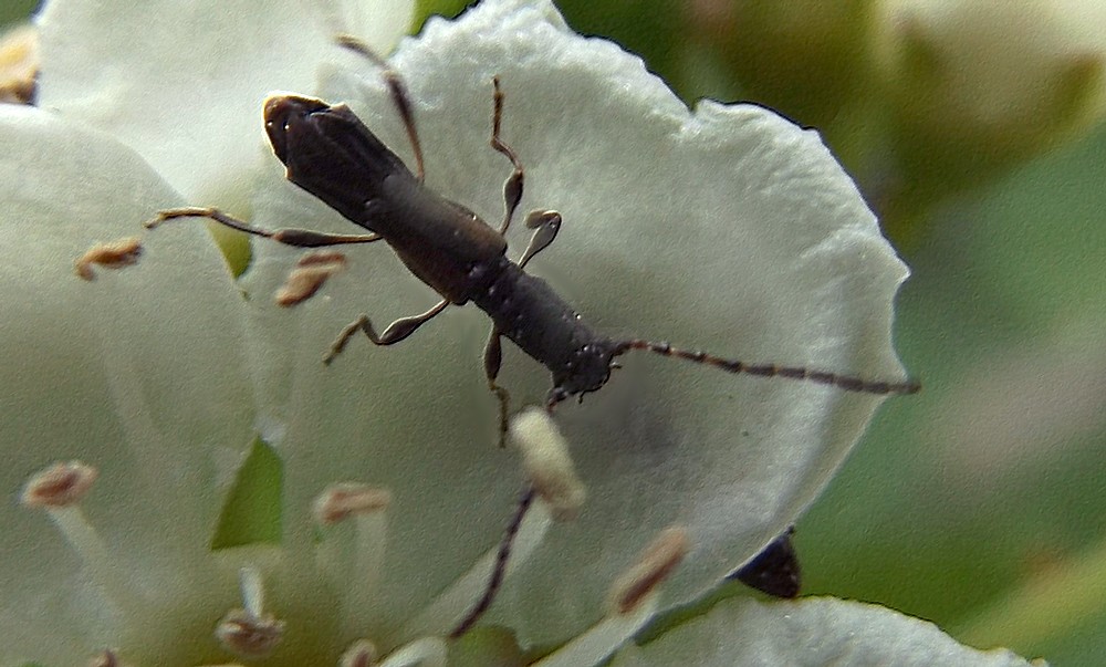Un piccolo coleottero forse Oedemeridae (credo) intento a cibarsi di polline sui fiori di biancospino. Sbaglio?