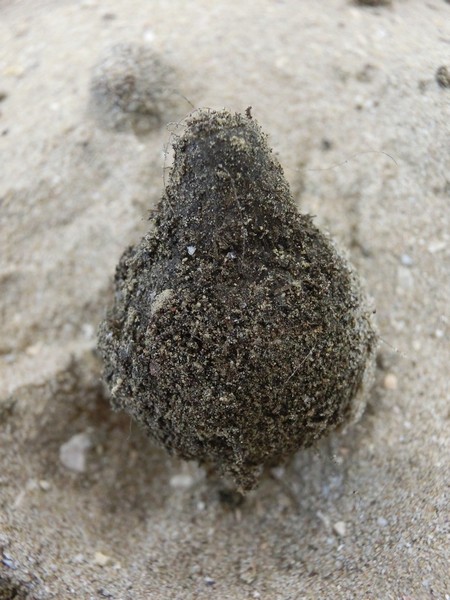 Notare la forma a pera; ho trovato diverse palline sferiche che credo siano solo alimentari, mentre alcune con il collo in cima al quale è deposto l'uovo e da li entra la larva: si intuiva la rosura fatta dalla larva per introdursi nella pallina.