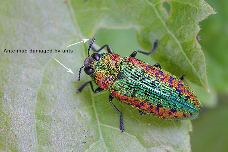 I've taken the first observations on Lamprodila rutilans in Hungary. The first specimens were getting out in the Budapest's city park. This is the most early data for me of these beetles. I took a few pictures of a specimen attacked by ants after its emerge from the exit hole. Most of the beetles were low near the ground and feeding fresh leaves.