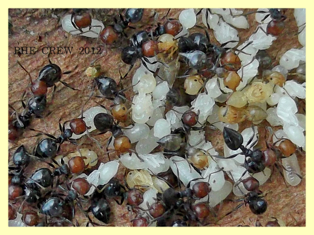 due foto che ritraggono una parte del formicaio con uova, individui adulti e giovani sotto corteccia di Eucalipto. fotografati ad Anzio (RM) il 16.IX.2012.