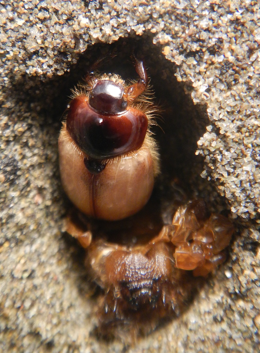 Lungo il litorale grossetano (ometto la località di proposito) sono state trovate, durante la gita sociale della Società per gli Studi Naturalistici della Romagna, numerose larve di questo bel coleottero psammofilo.