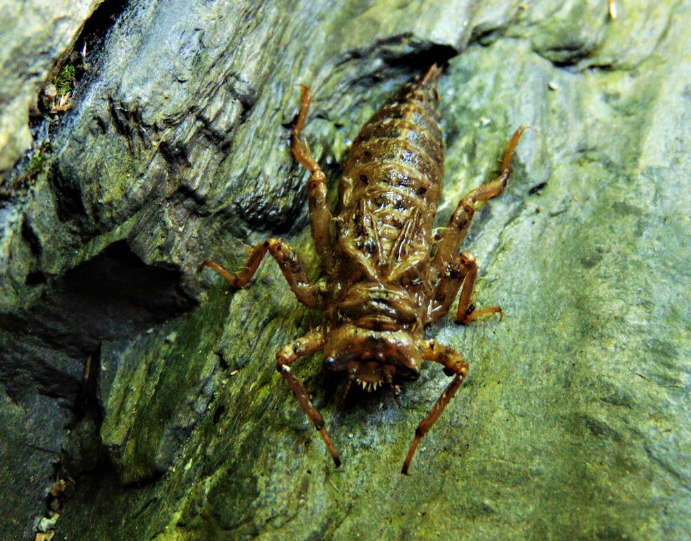 Ninfa di Odonato Anisottero. Un esperto di forme giovanili di libellule credo non abbia difficoltà a proseguire ulteriormente e velocemente nell'identificazione. Esistono a tal fine ottimi testi (in italiano, inglese, francese, tedesco ecc.). L'apparato boccale delle forme giovanili di Odonati è masticatore modificato e il suo elemento più caratteristico e vistoso è la 'maschera' velocemente estensibile e retrattile, situata inferiormente, che serve per afferrare le prede in acqua. La maschera deriva dalla modificazione-trasformazione del labbro inferiore.