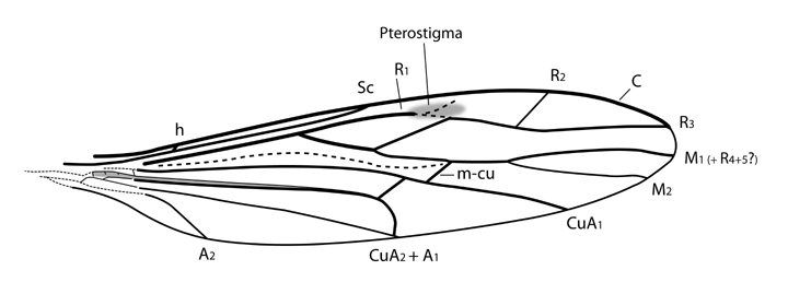 Liviomolaidae A me pare una chimera, una via di mezzo tra (cfr.) Bolitophilidae, Axymyiidae e Perissommatidae  . Ho cercato di ricostruire lo schema delle nervature alari dando una mia interpretazione e basandomi su entrambe le ali. (h) omerale; (Sc) subcostale; (R1) prima nervatura radiale, attenuata all'apice, quasi collegata a metà del ramo della forca radiale (R2,R3), con uno pterostigma; (C) costale terminante in R3; (M1, M2) forca mediana, M1 forse fusa con le nervature radiali R4+5, il ramo della forca mediana conserva forse una traccia che prosegue verso la base (linea tratteggiata) - confr. con Perissommatidae -; (m-cu) collegamento medio-cubitale; (CuA1, CuA2) cubitali, CuA2 unito apicalmente alla prima nervatura anale (A1); (A2) seconda nervatura anale. Non vorrei giungere a conclusioni azzardate, ma non mi sembra che coincide con nessuna delle famiglie di nematoceri attualmente presenti in Italia, e forse a nessuna di quelle europee. Personalmente invierei la foto a qualche specialista di nematoceri, oppure proverei a postarlo su Diptera.info tanto per vedere cosa ne pensano, magari è una banalità (  ). Gentilmente, mi misureresti la lunghezza dell'ala che non ho capito bene quanto misura l'"essere"?