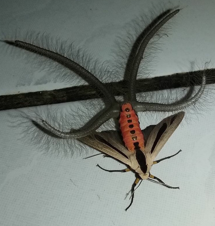 Si tratta di un maschio di Creatonotos gangis (Linnaeus, 1763) (Arctiidae... o Erebidae :roll: ). Le strutture addominali sono i coremata, organi sacciformi estensibili responsabili della diffusione di sostanze di richiamo (non so se è corretto parlare di feromoni). Rientrano nella categoria dei famosi organi odoriferi (scent organs).